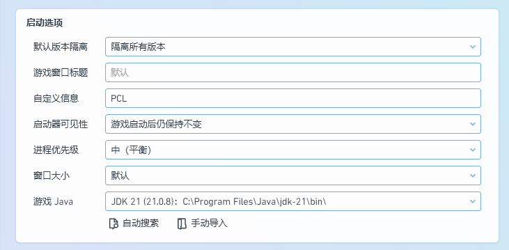 4)、打开pcl2启动器,在设置/启动/启动选项中点击自动搜索,将游戏java选项调整至JDK21(如果没看见请检查步骤3是否正确安装)